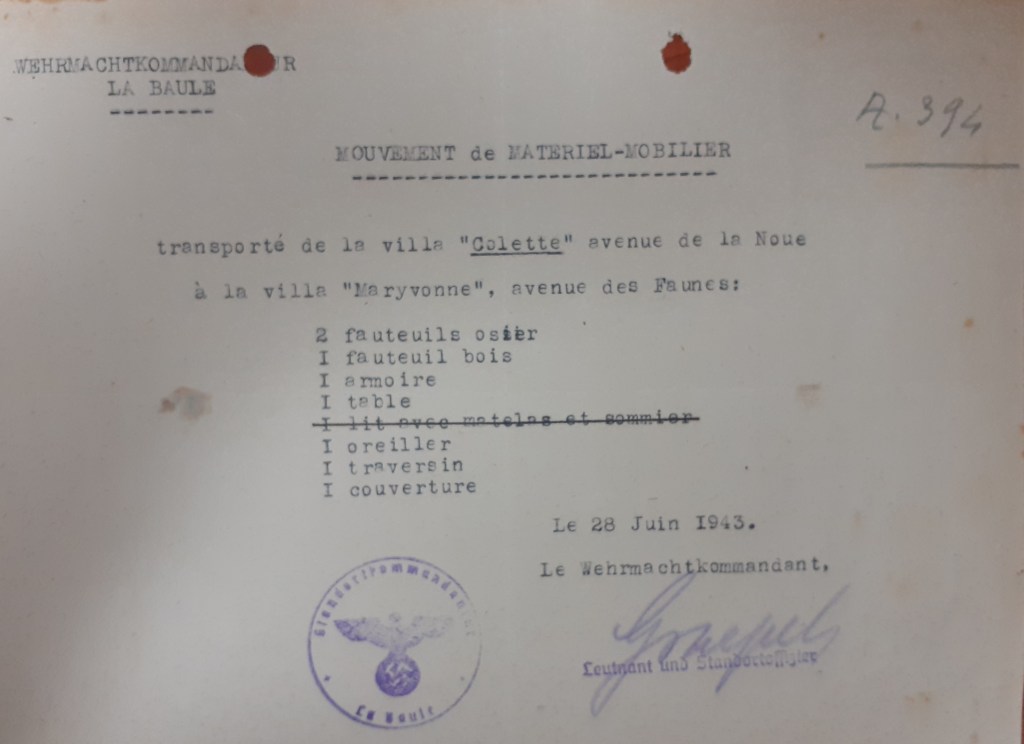 En plus de ces inventaires, l’armée allemande notait chaque transfert de mobilier d’une villa à une autre :