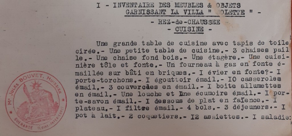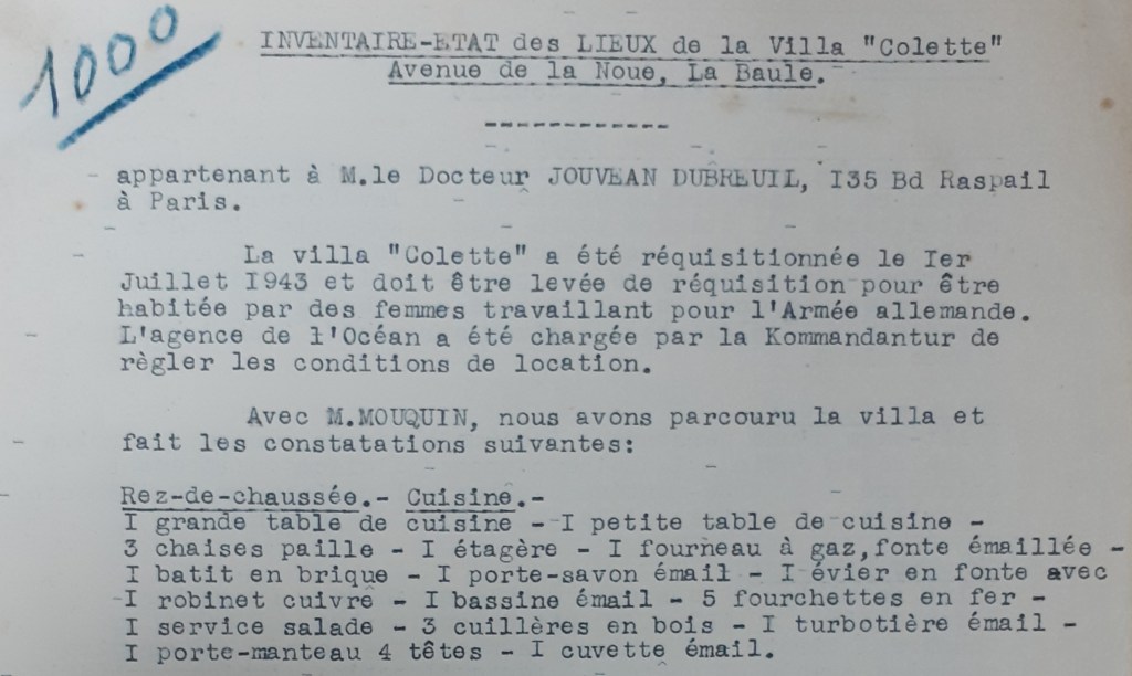 C’est de cela que j’aimerais parler aujourd’hui. Aux archives de la ville de la Baule-Escoublac (Loire-Atlantique), la sous série 4H est consacrée aux dossiers des villas réquisitionnées par l’armée allemande. Les dossiers peuvent être constitués de différentes pièces comme des inventaires (au moment de l’installation des Allemands, et à leur départ), des correspondances, des états des lieux. Ces dossiers ont été constitués dans le but d’une indemnité dans le cadre des dommages de guerre. Ils s’étendent de 1943 à 1945 environ.